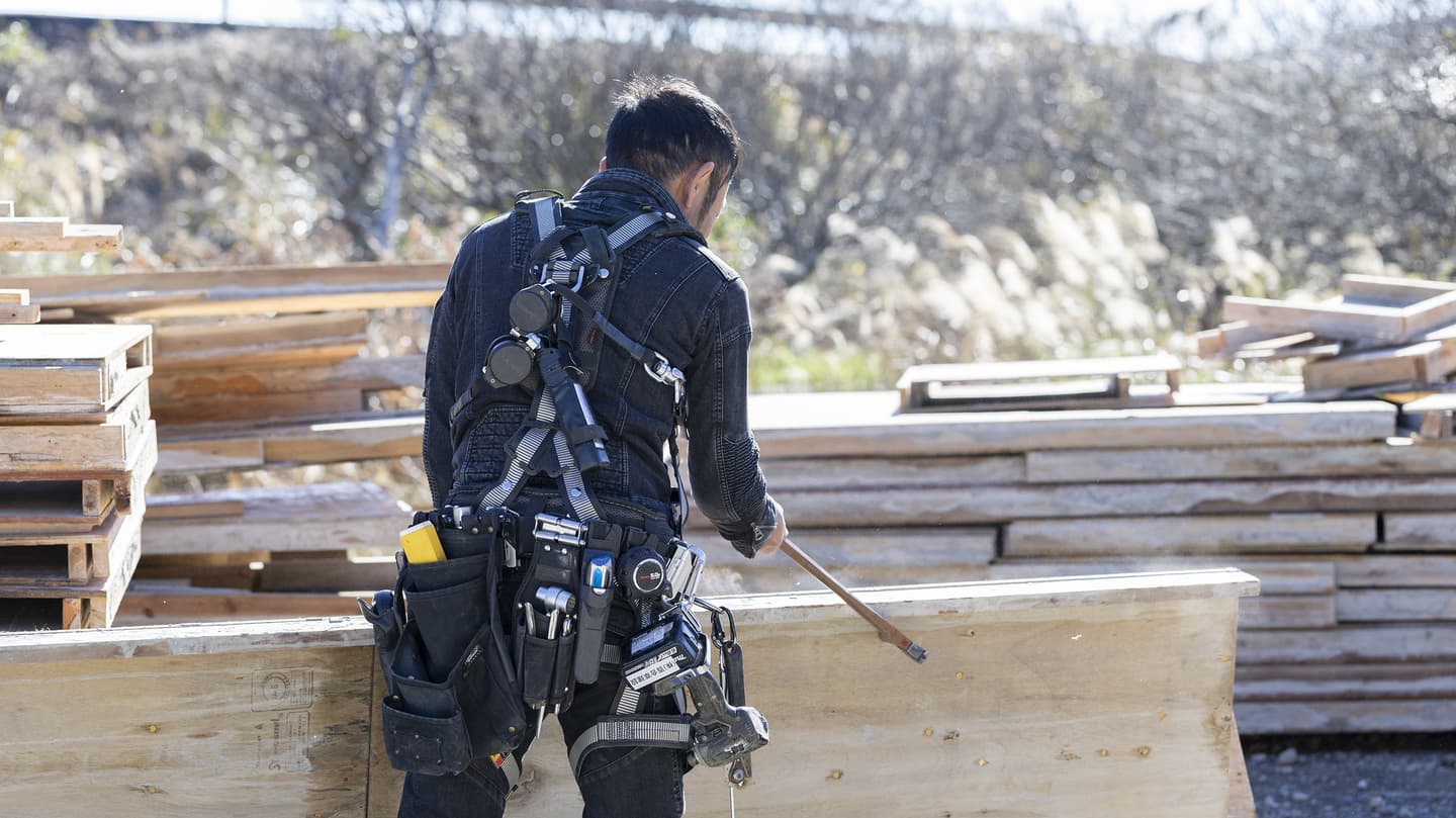 現場で、型枠を建てる場所に墨を出します。ミリ単位の精度が要求される型枠大工にとって、最も重要な作業となります。墨が出たら、その位置にぴったりと加工した型枠を建てていきます。型枠の通りに建物は出来上がっていくので、水平・垂直を見ながら、正確に型枠を建て込んでいきます。